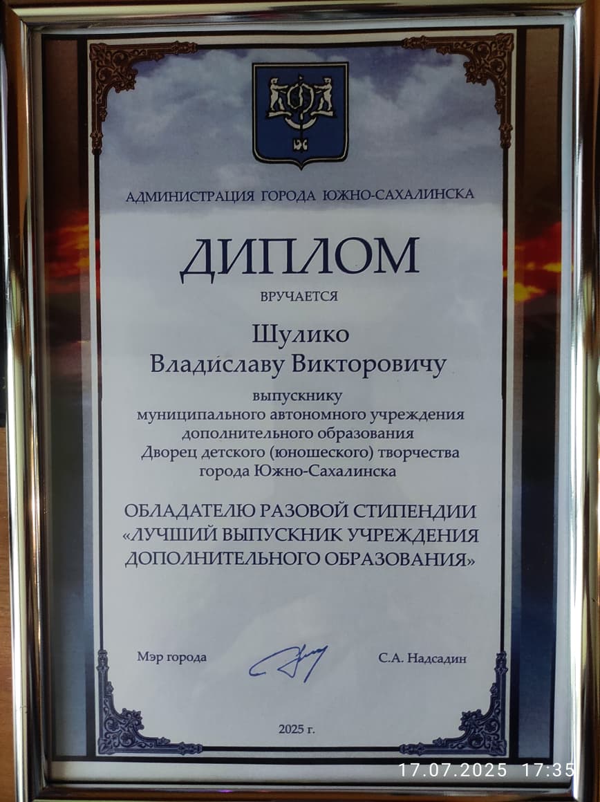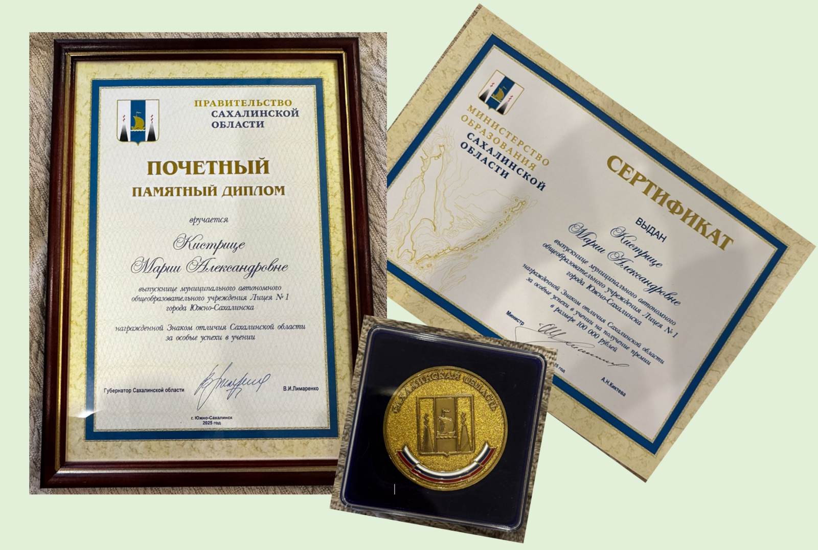 Почетный диплом и сертификат выпускника, награжденного знаком отличия Сахалинской области (2025)