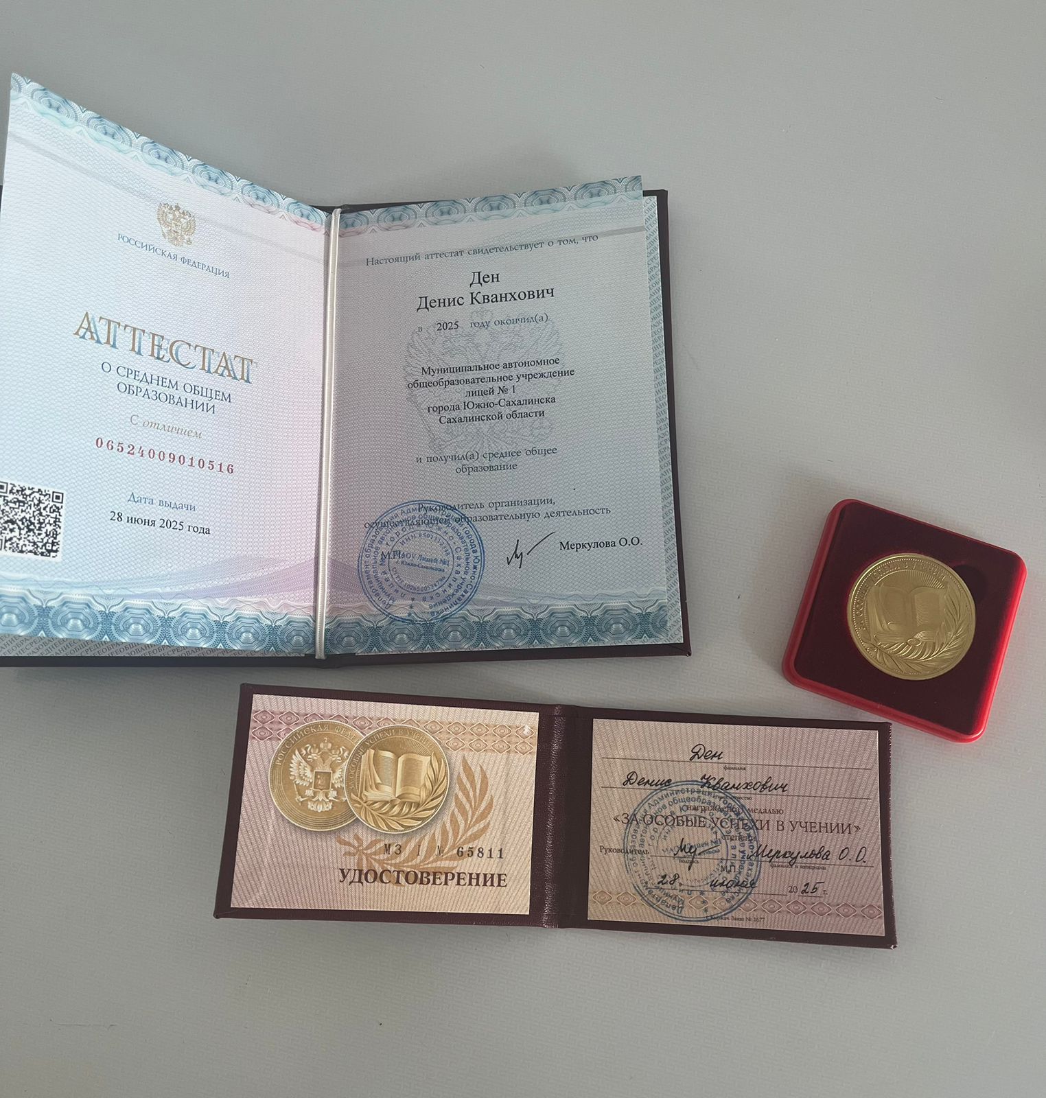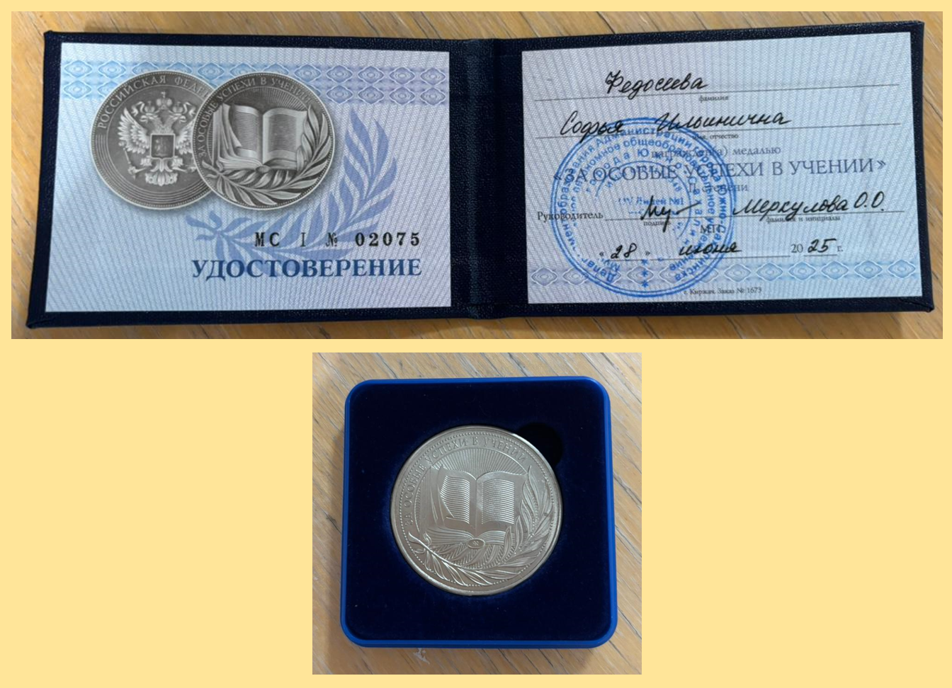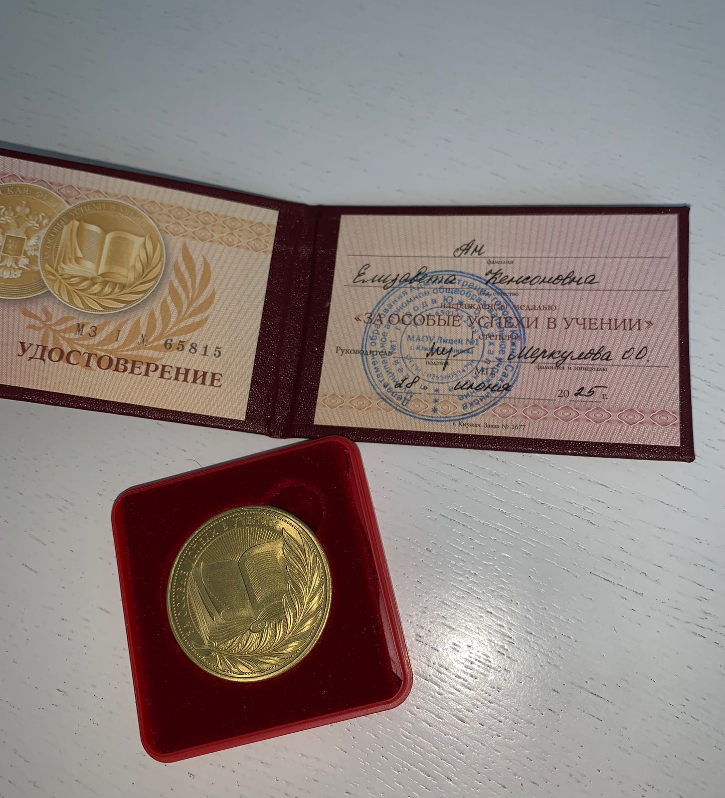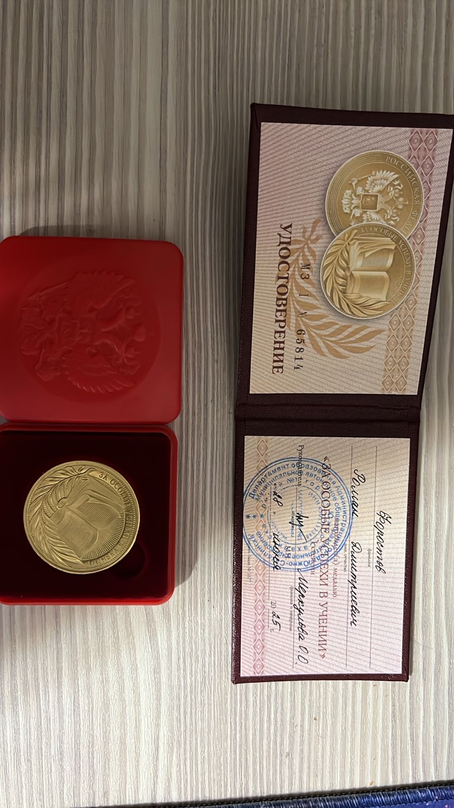 Медаль и удостоверение о награждении золотой медалью "За особые успехи в учении" (2025)