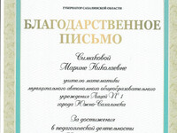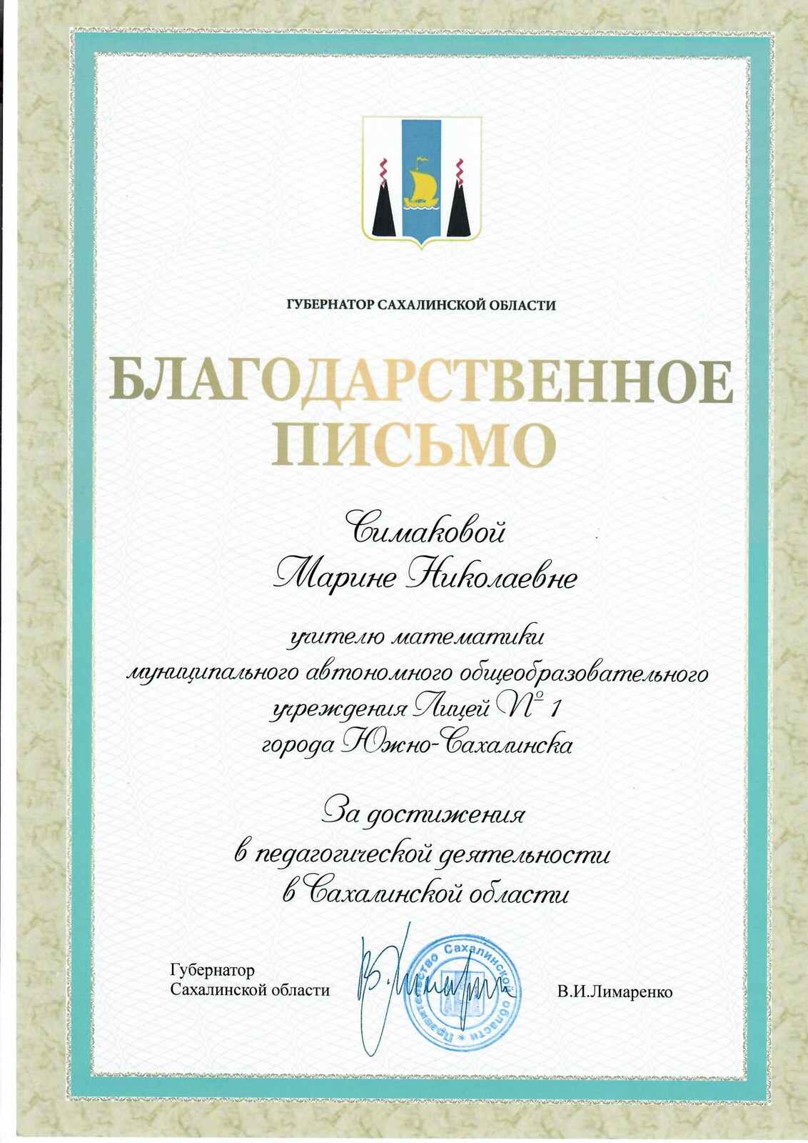 Благодарственное письмо губернатора Сахалинской области (2025г.)