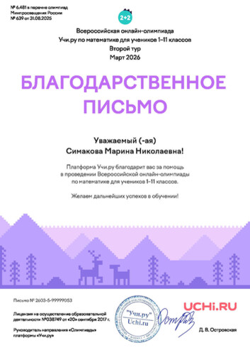 Благодарственное письмо за помощь в проведении Всероссийской онлайн-олимпиады Учи.ру (второй тур) (2026)