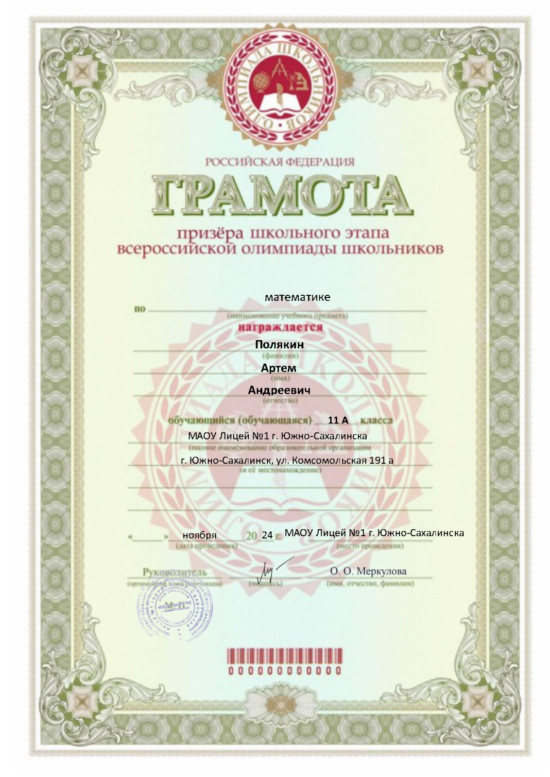 Главная » Фотоальбом » Симакова М.Н. » Грамоты обучающихся (олимпиады) » Призер ЛО Полякин (2024)