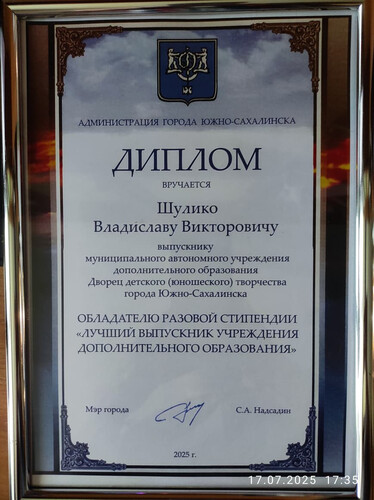 Главная » Фотоальбом » Симакова М.Н. » Награды выпускников » Диплом обладателя стипендии Шулико (2025)